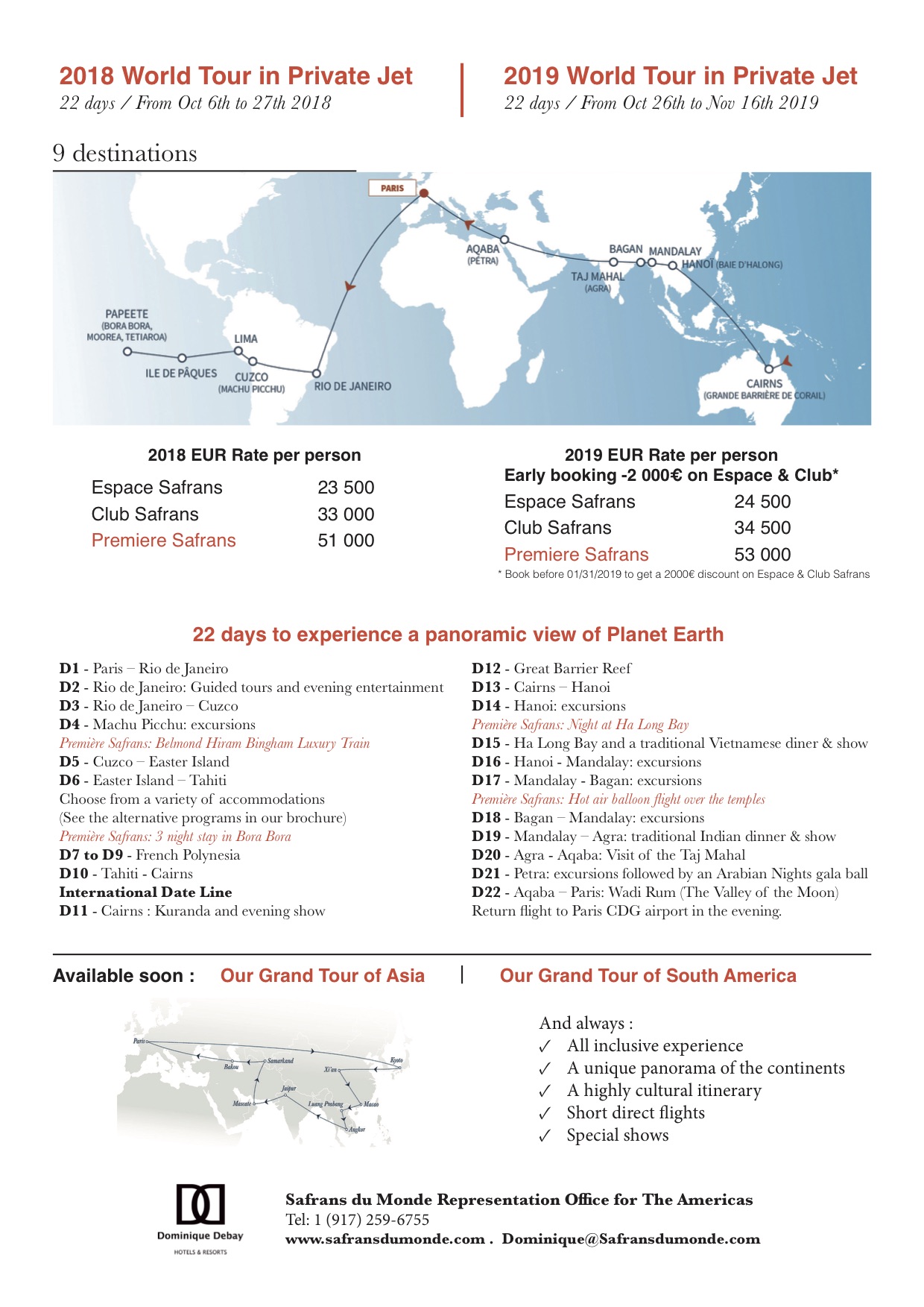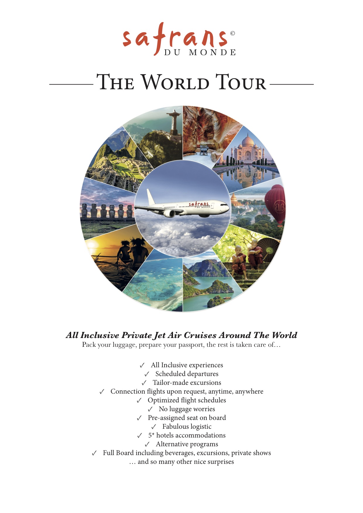 Enjoy a trip around the world, with an all inclusive opportunity with Air Cruise by Safrans du Monde! Pack your luggage, prepare your passport, we are in charge of all the rest. And it is All Inclusive : super fast track access to your private jet, your pre-assigned seat on board, accommodation in 5* hotels, Full Board including beverages, excursions, private shows and so many nice surprises…